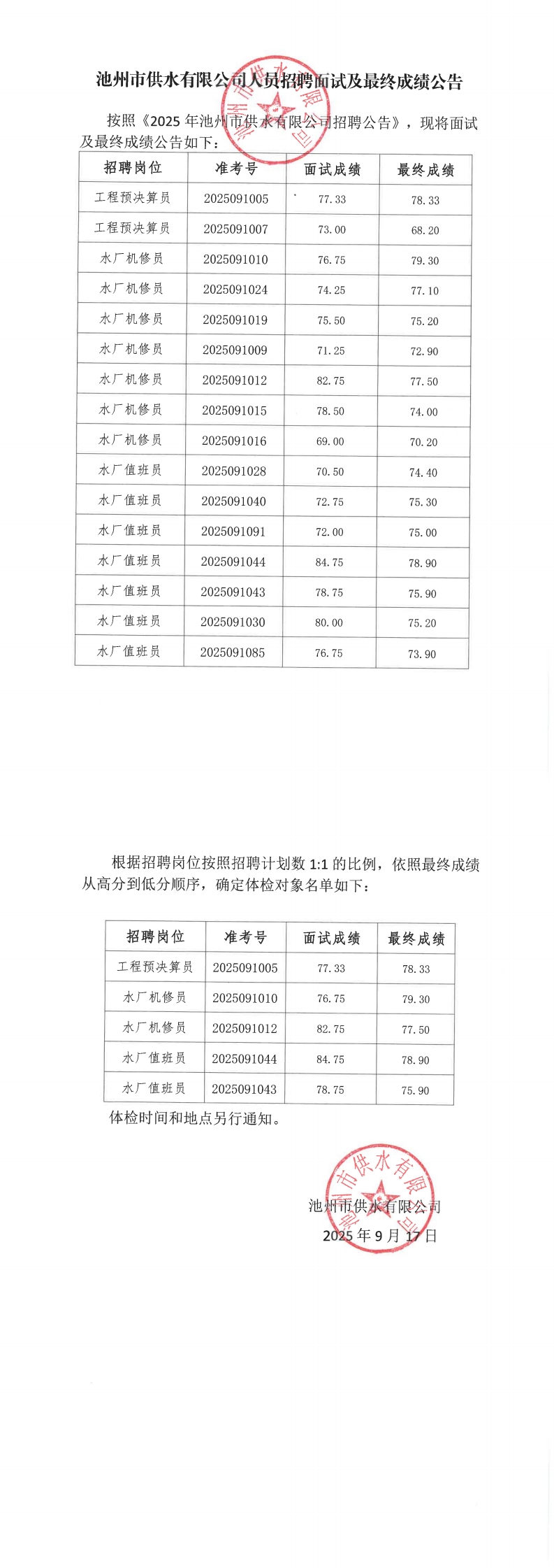 | 池州市供水有限公司人員招聘面試及最終成績(jī)公告 | |