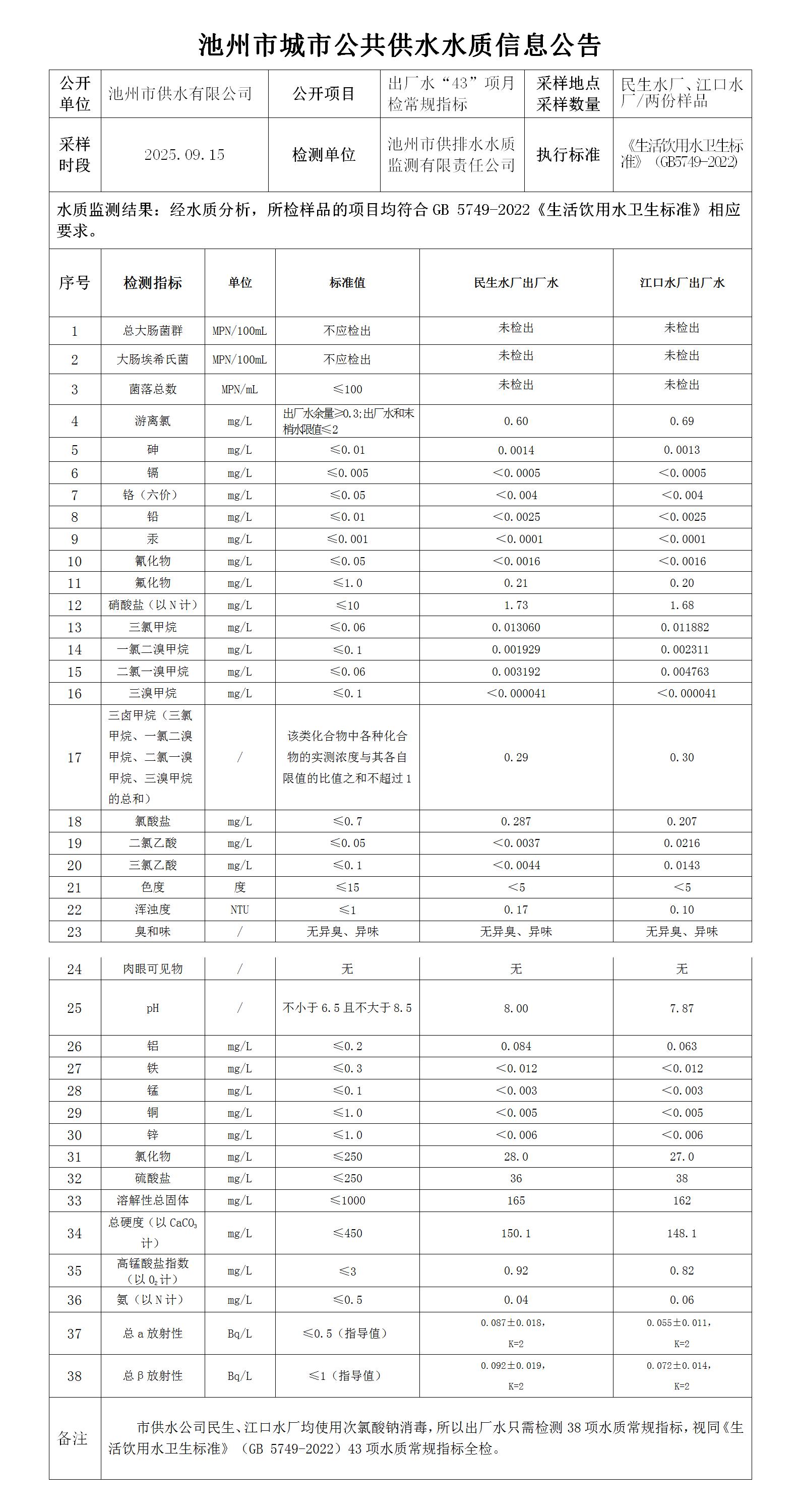 | 池州市城市公共供水水質(zhì)信息公告9月份出廠水月檢常規(guī)指標 | |